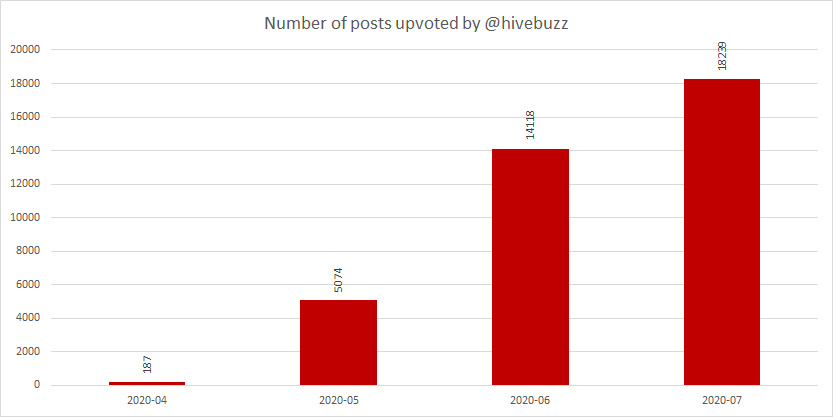Here's a chart with the number of votes made every month. You will notice that @hivebuzz has upvoted 51007 posts, with up to 18239 posts per month for the last 3 months.